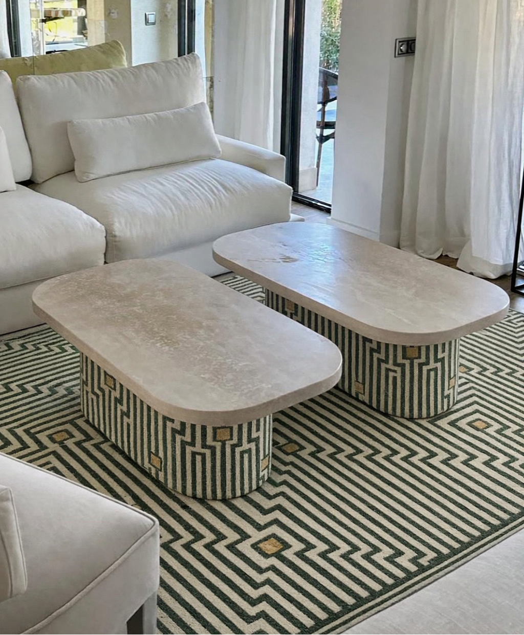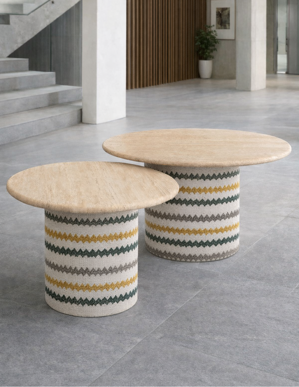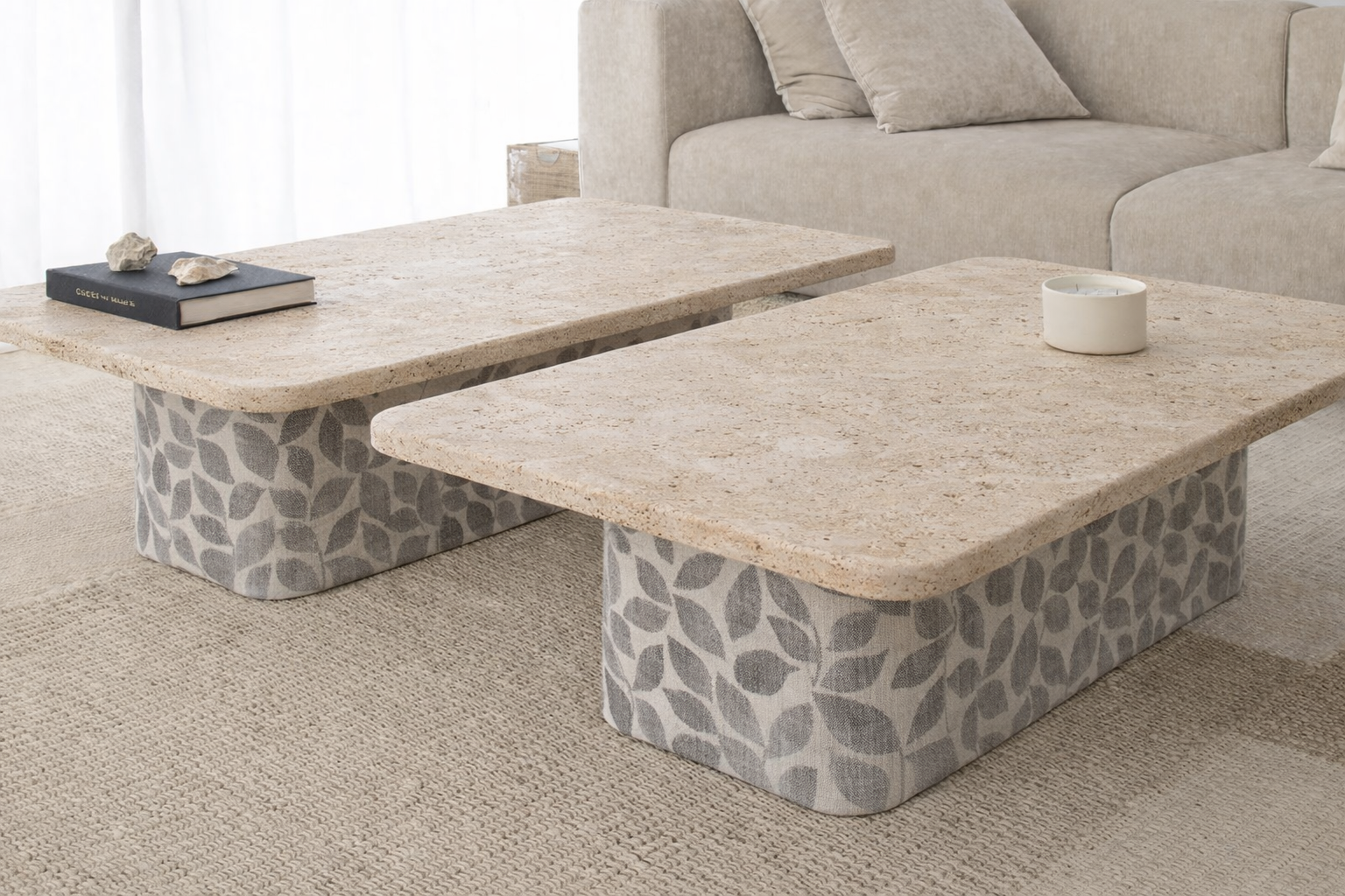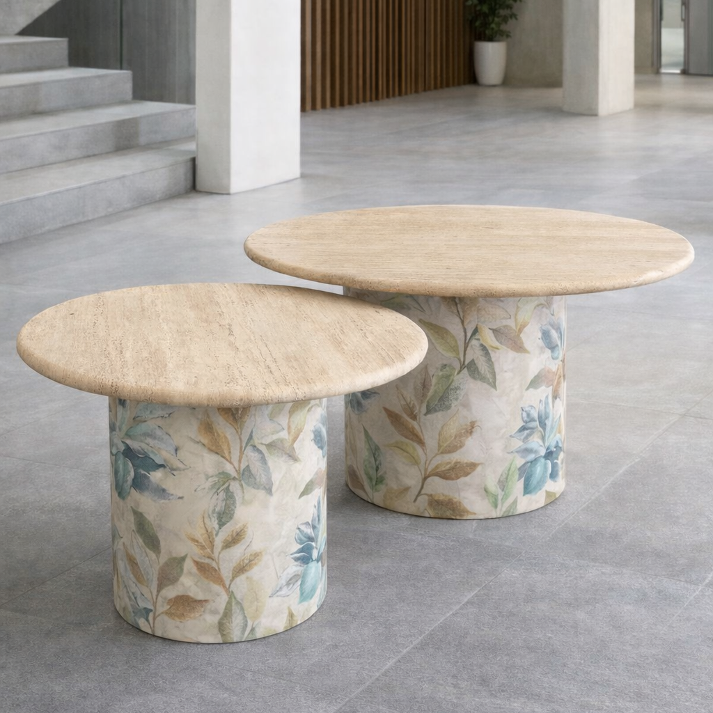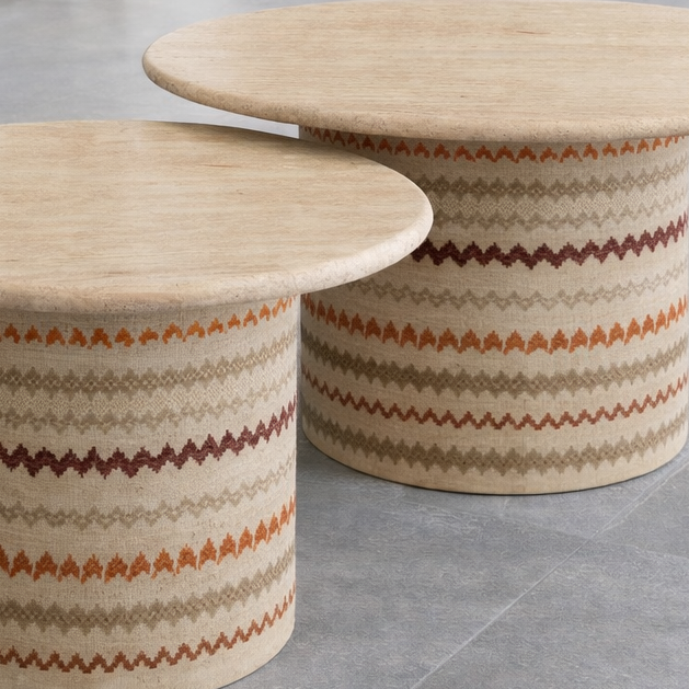Set de mesas nido, ideal para crear composiciones versátiles, con un toque de originalidad combinando piedra natural y bases tapizadas