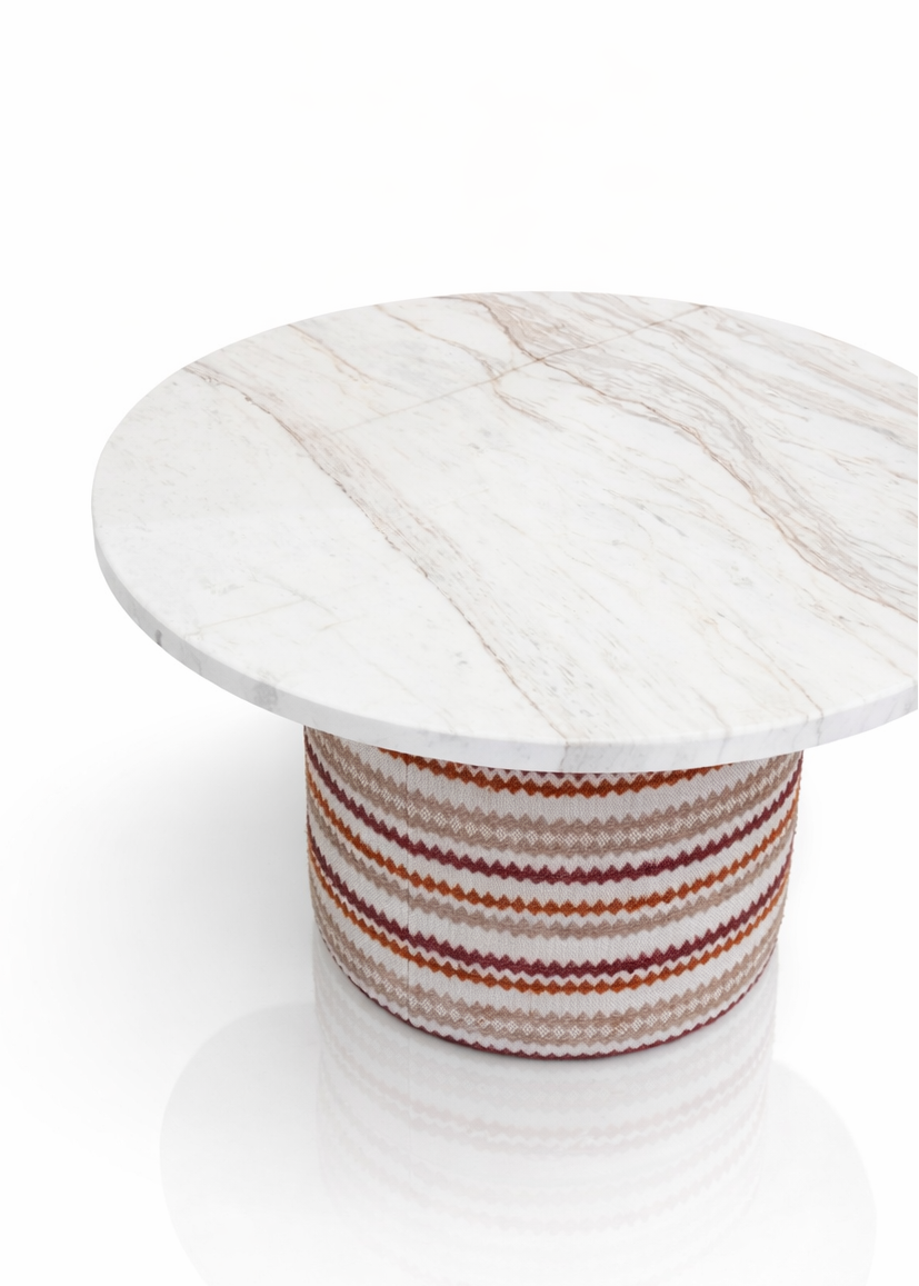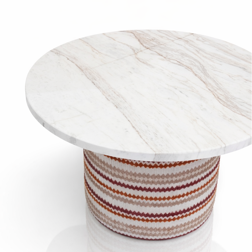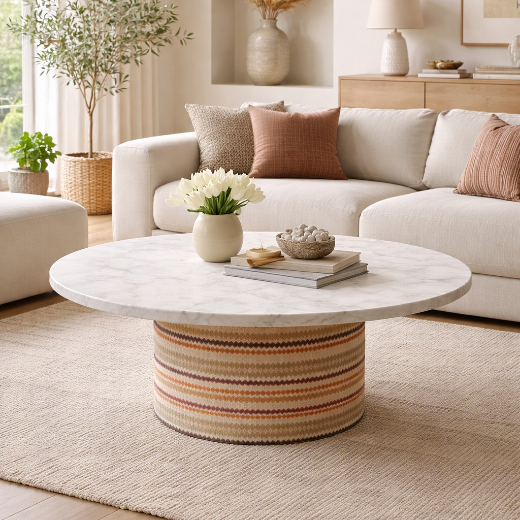 Su tapa redonda y base cilíndrica crean una mesa ligera, estable y con carácter. Ideal para espacios que buscan una pieza central con estilo.