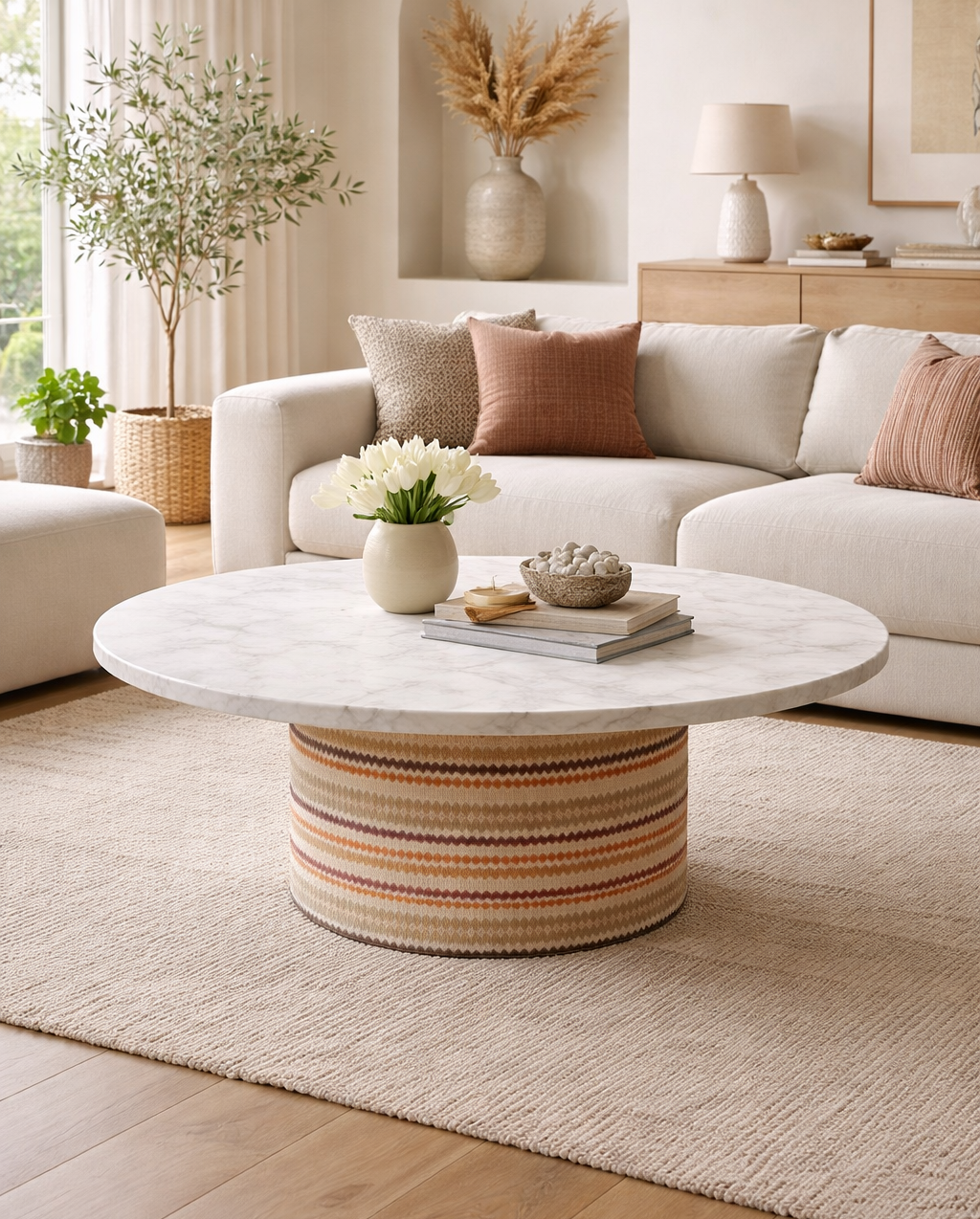 Compacta y con curvas suaves. Su base ovalada central aporta movimiento y equilibrio, en una pieza que se adapta con discreción a cualquier salón