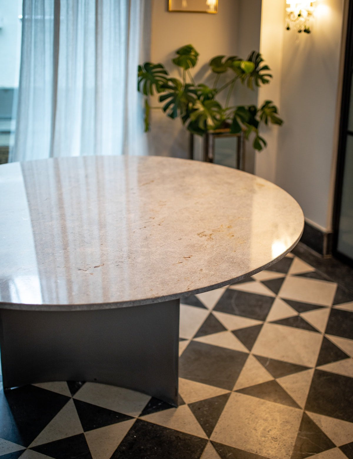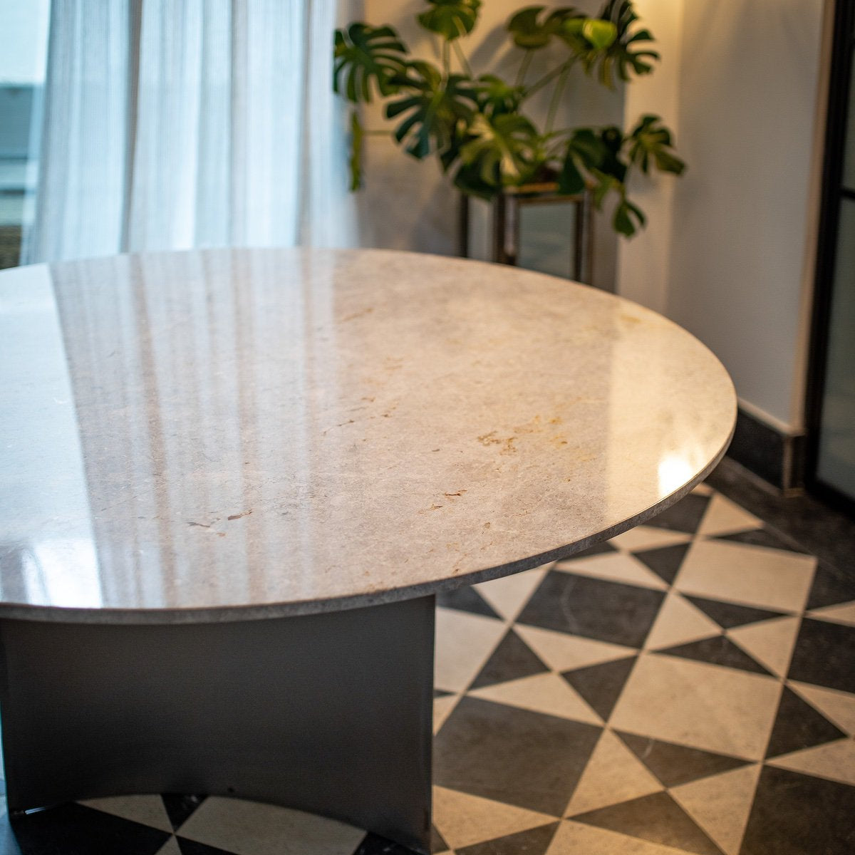 Destaca por su estructura de hierro de diseño único y original, que combina robustez con una estética vanguardista. Su tapa de piedra natural, con una forma regular, aporta un toque de elegancia atemporal y un contraste perfecto con la