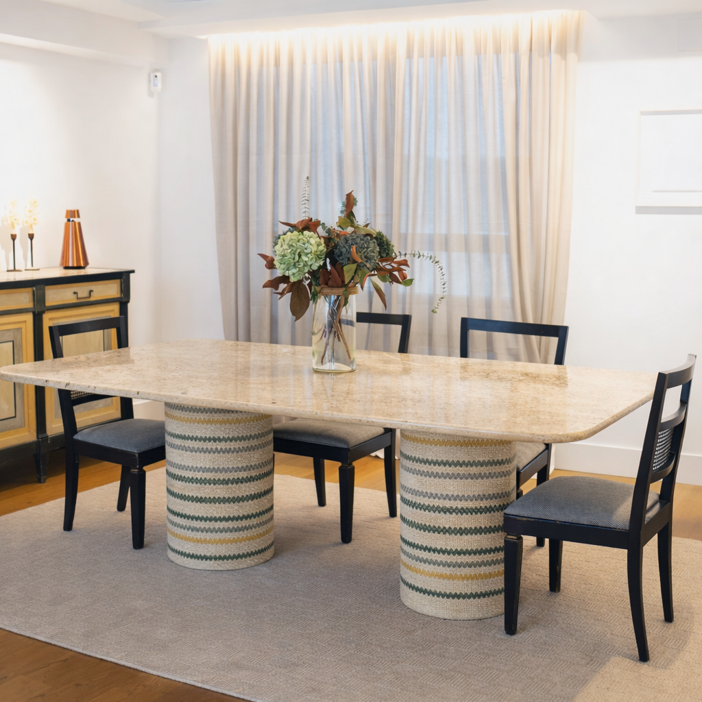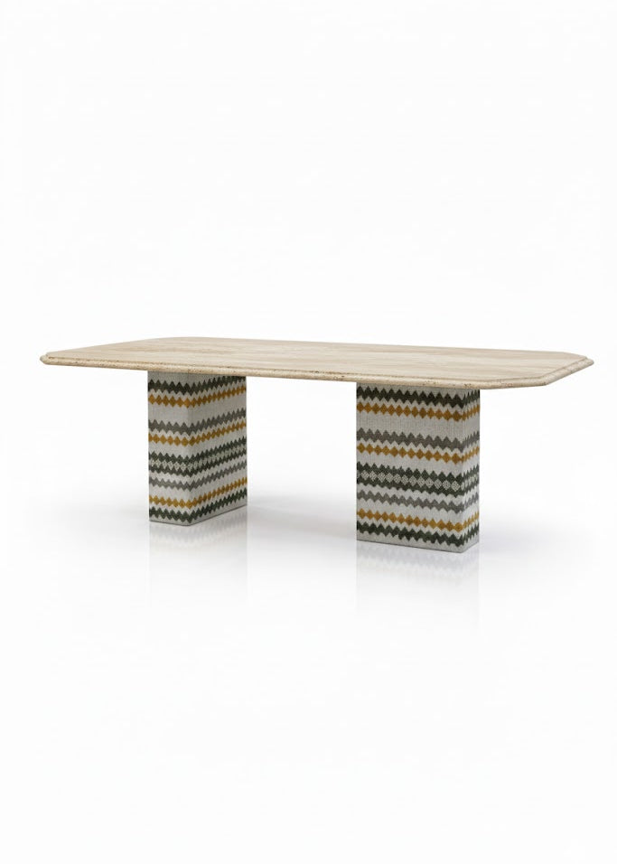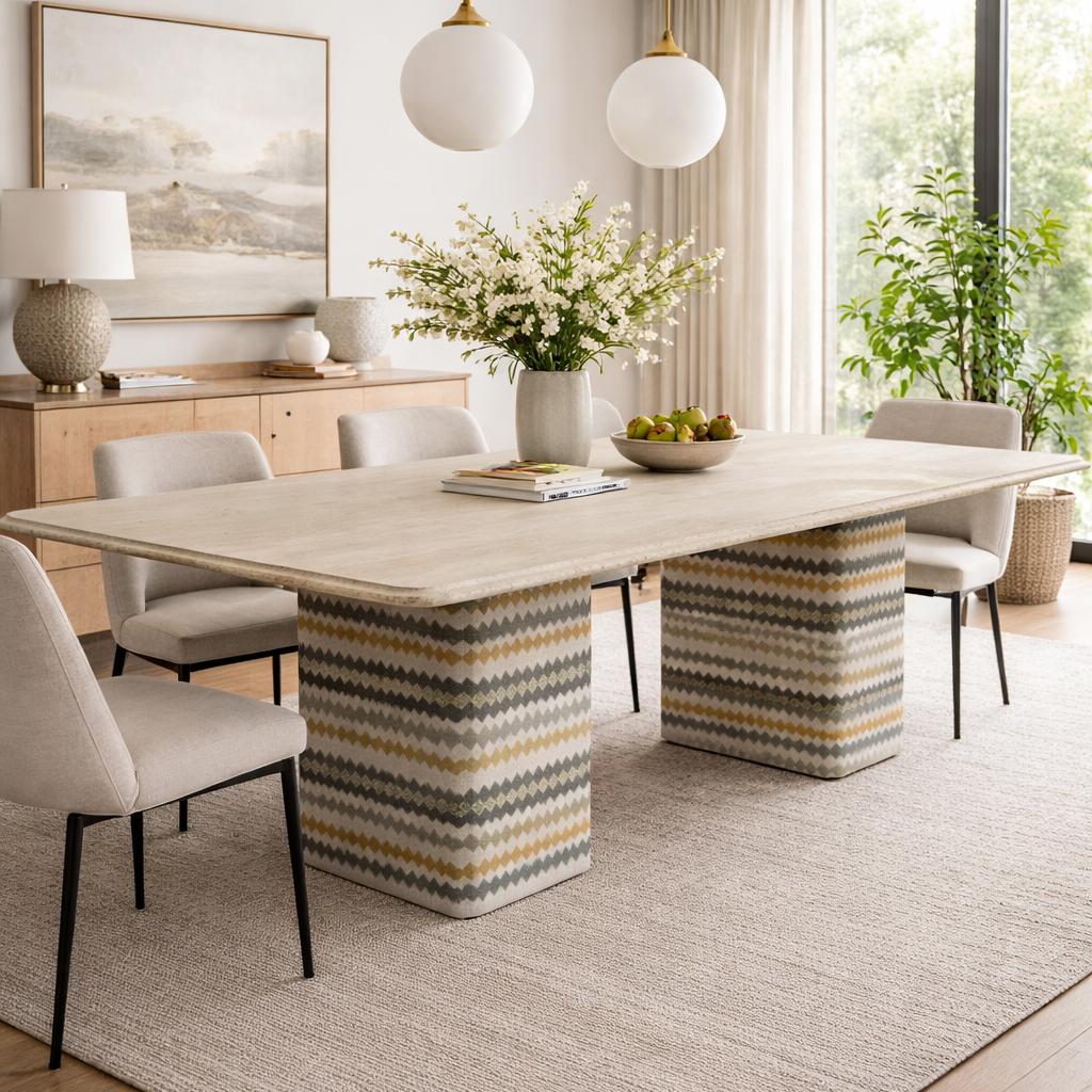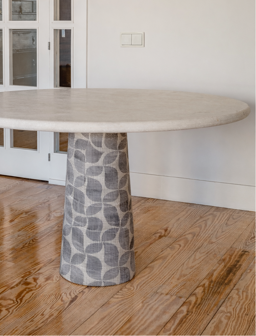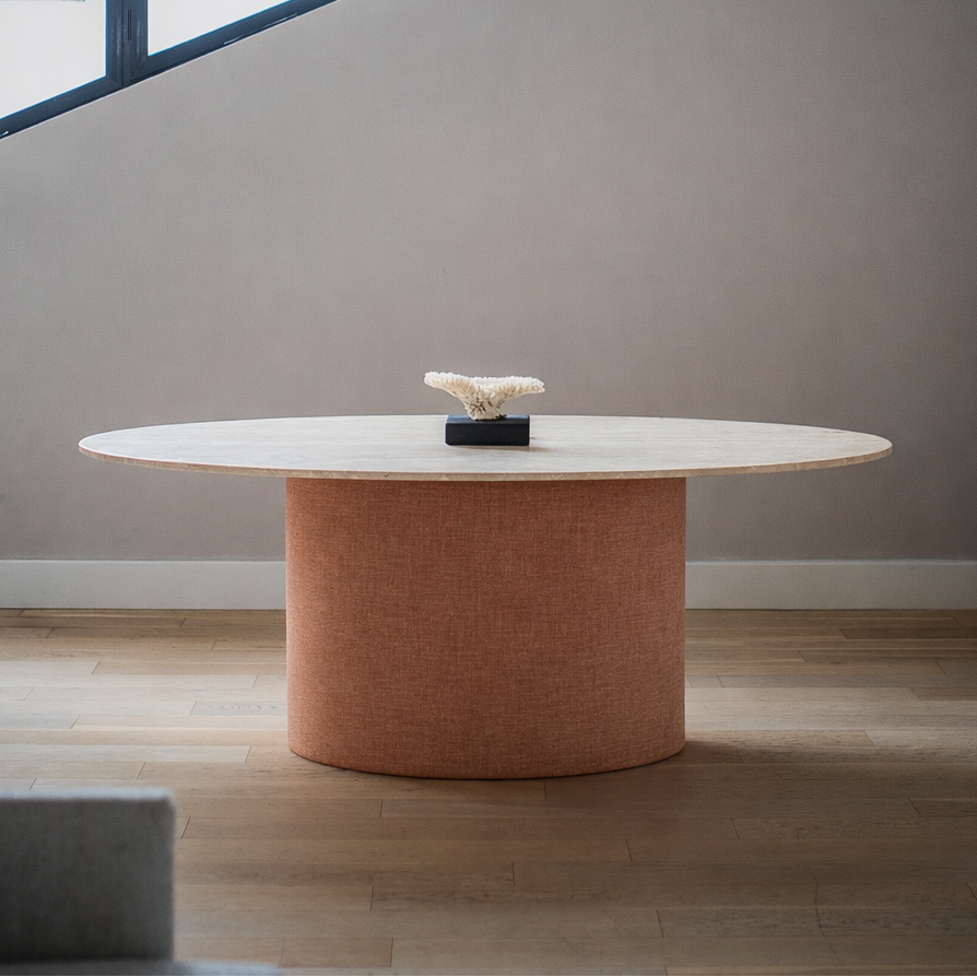Inspirada en la esencia de la India, la mesa Delhi combina piedra natural y una base cónica tapizada, creando un diseño dónde la materia, la textura y el equilibrio son protagonistas.