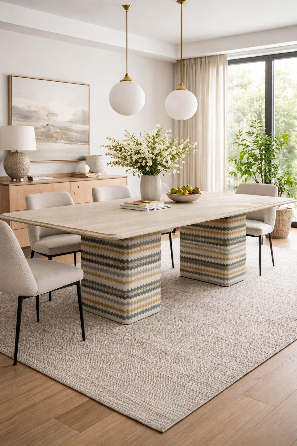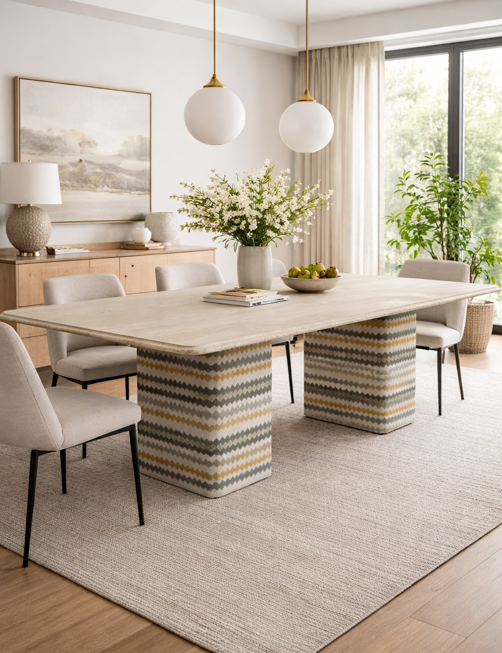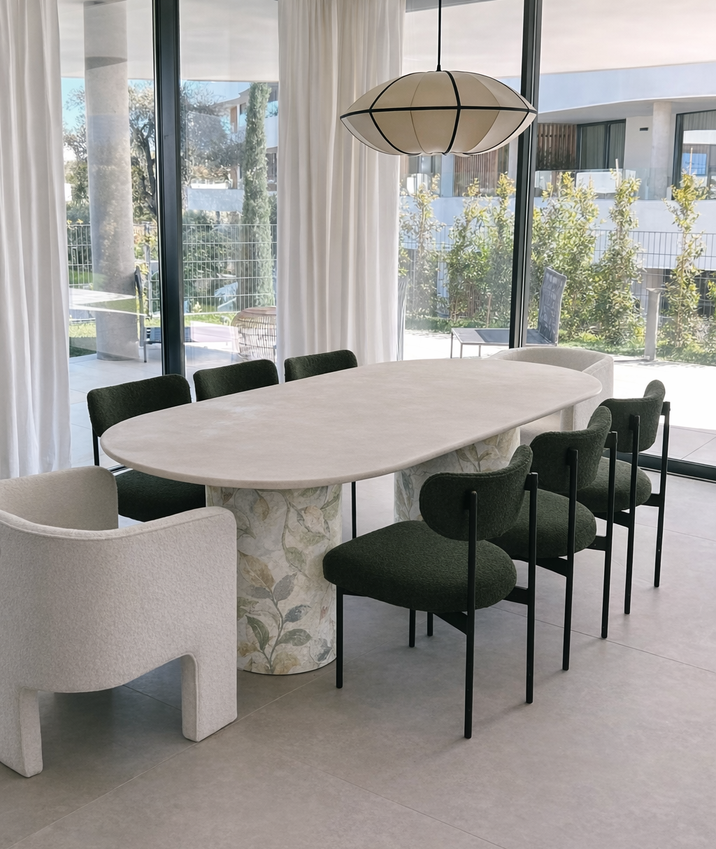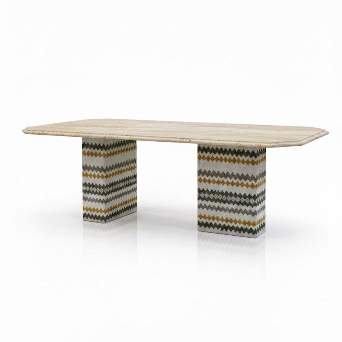 Inspirada en la esencia de la India, la mesa Delhi combina piedra natural y una base cónica tapizada, creando un diseño dónde la materia, la textura y el equilibrio son protagonistas.