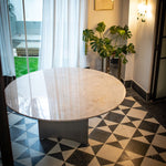 Mesas con tapa de piedra natural y base elaborada en madera tapizada con la tela de su elección.