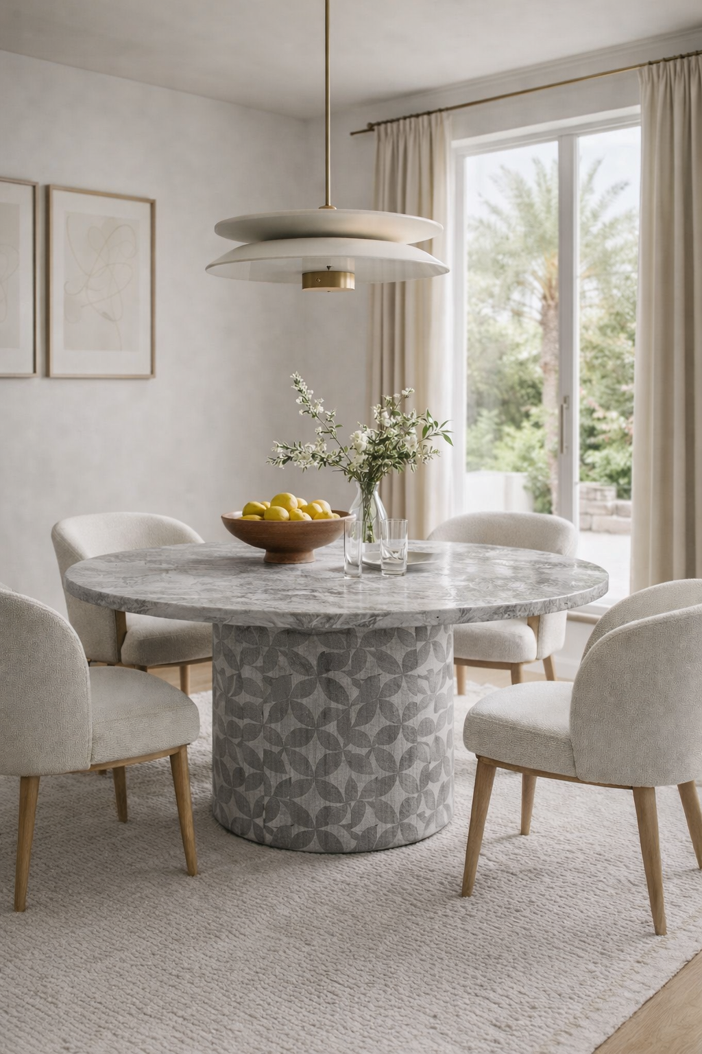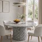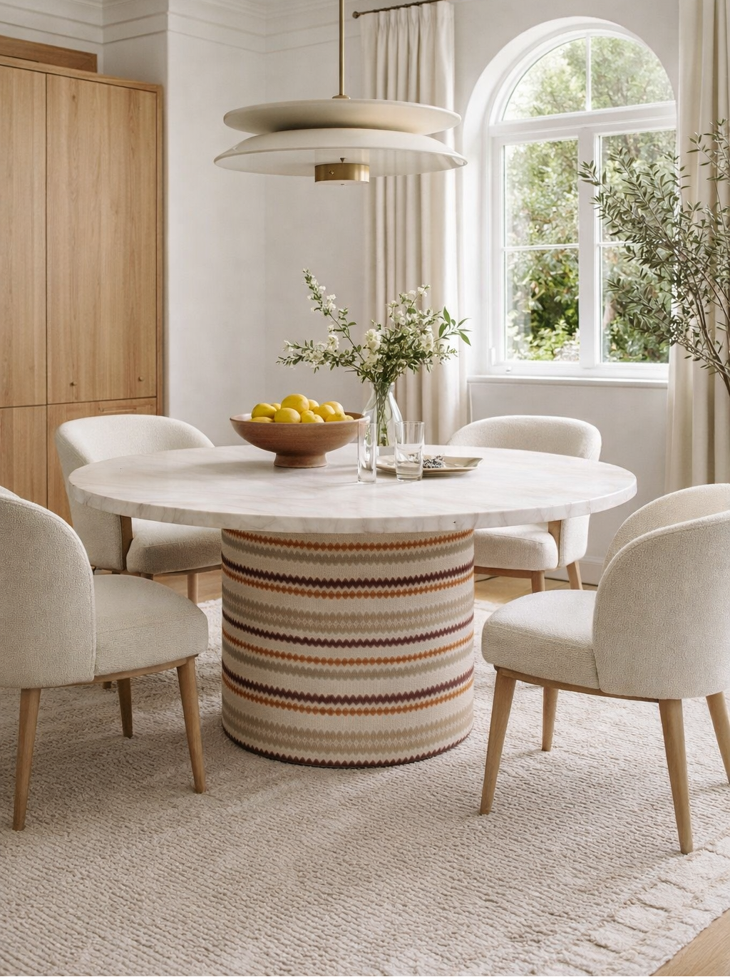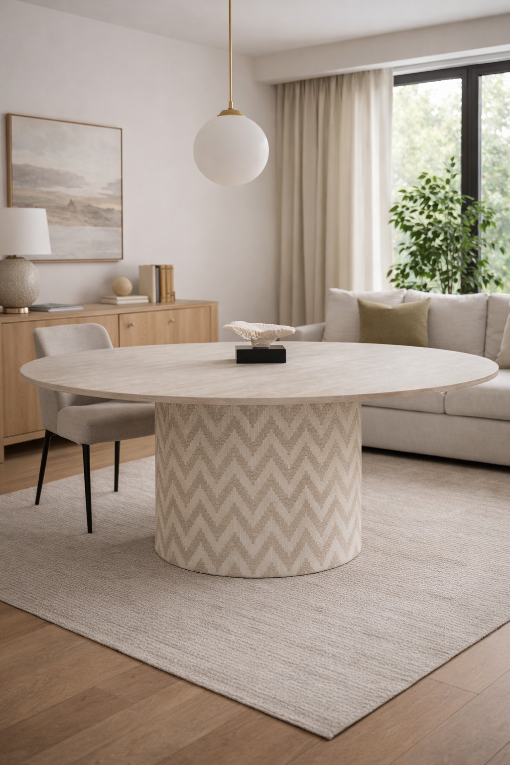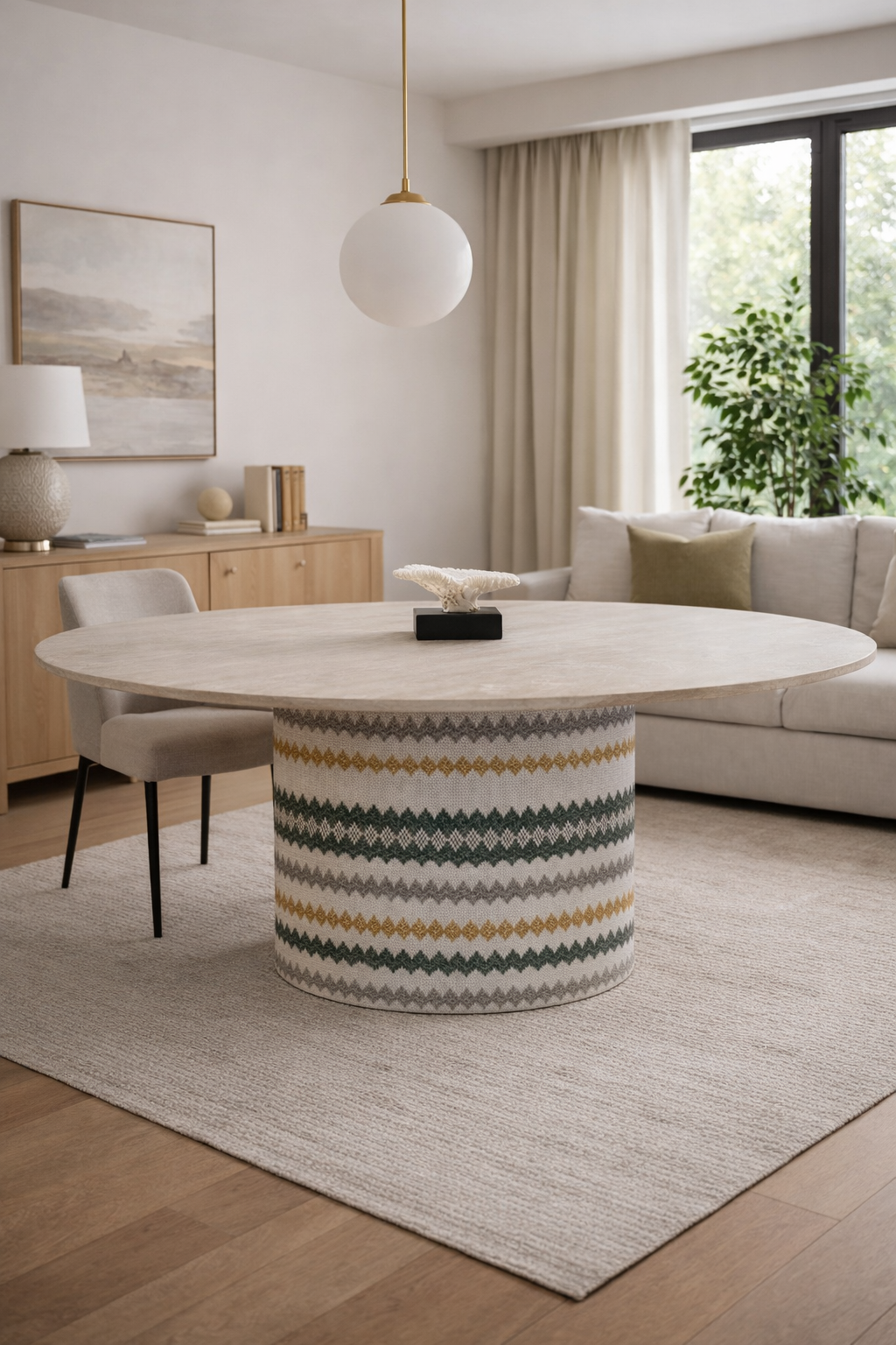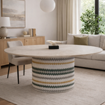 Apuesta por la cercanía. Su base cilíndrica central aporta estabilidad y calidez, creando una mesa acogedora, perfecta para espacios que priorizan la conexión