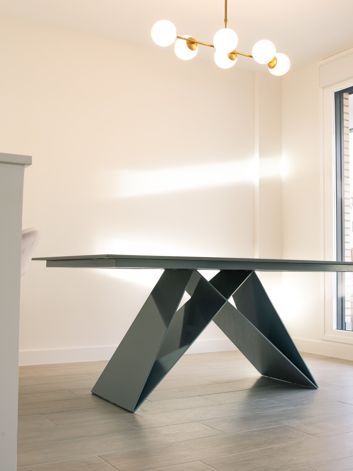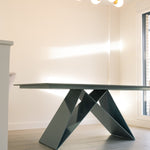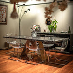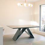 Destaca por su estructura de hierro de diseño único y original, que combina robustez con una estética vanguardista. Su tapa de piedra natural, con una forma regular, aporta un toque de elegancia atemporal y un contraste perfecto con la base moderna.