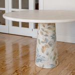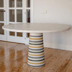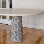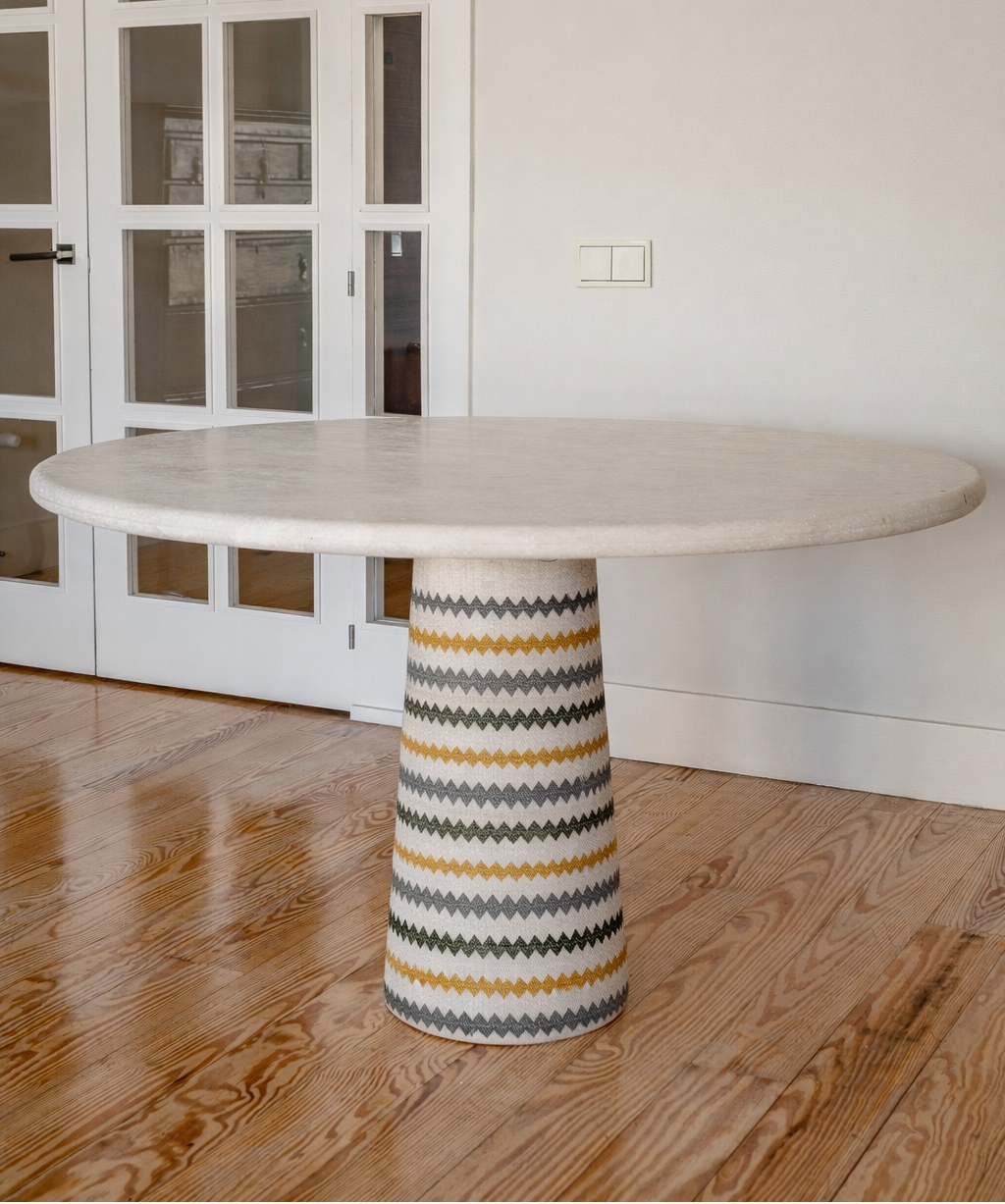 Inspirada en la esencia de la India, la mesa Delhi combina piedra natural y una base cónica tapizada, creando un diseño dónde la materia, la textura y el equilibrio son protagonistas