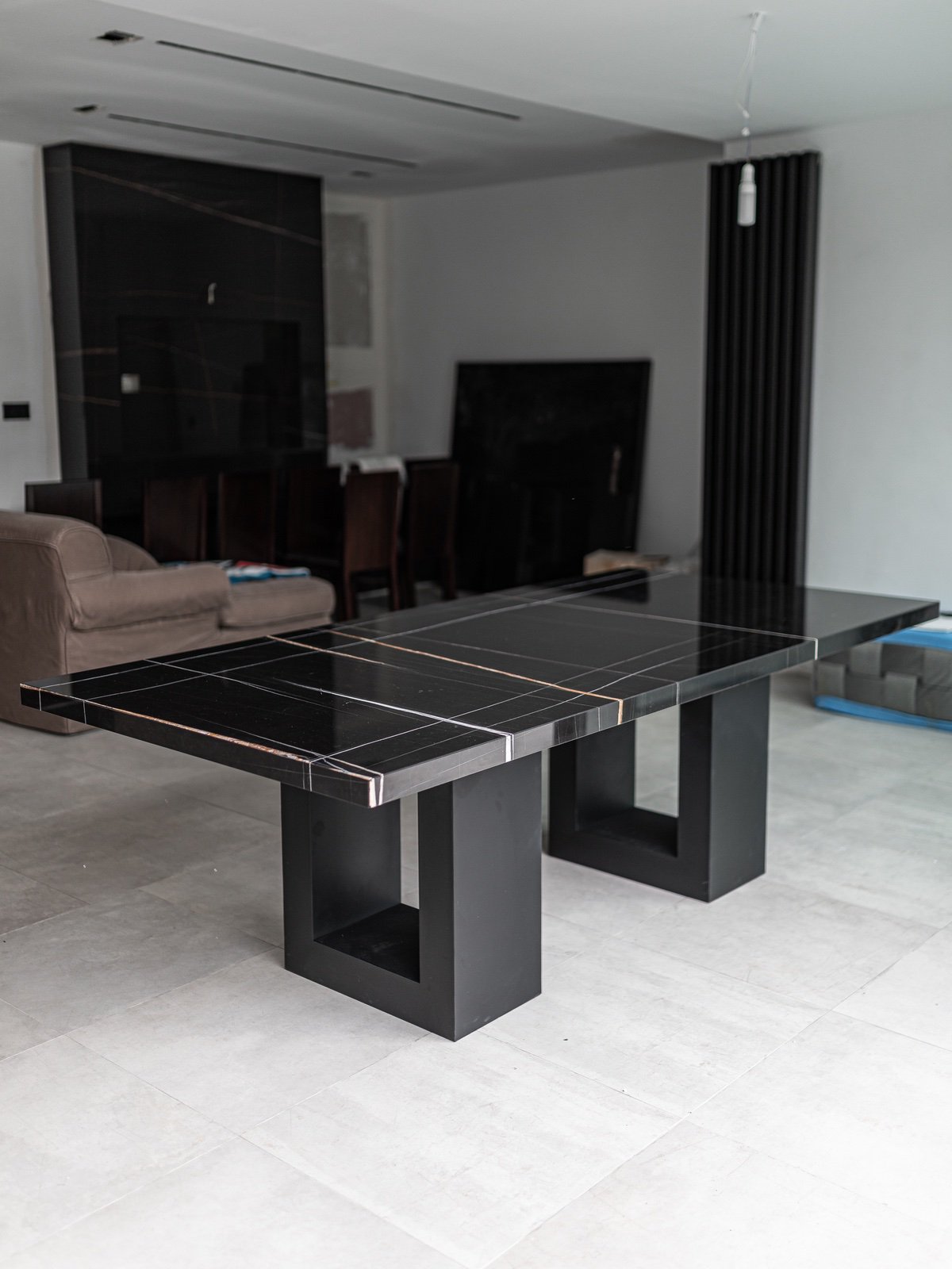 Mesas con tapa de piedra natural y base elaborada en madera tapizada con la tela de su elección.