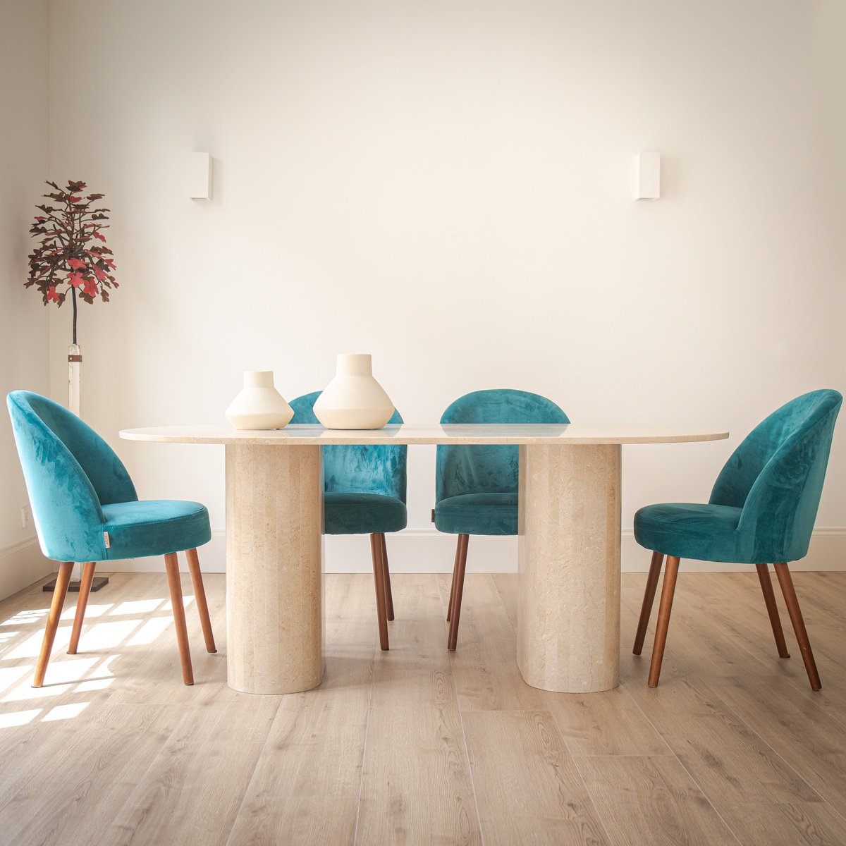 Sus bases redondeadas transmiten presencia, mientras que su tapa aporta ligereza. El contraste entre la robustez de los pies y la delicadeza de la tapa crea un equilibrio visual perfecto.